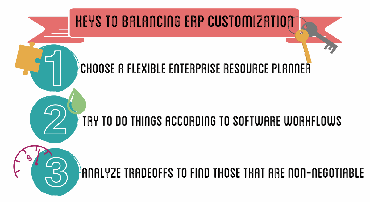 1. Choosing a flexible ERP, like Odoo, will give you maximum functionality right from the start. Through configuration, the process of aligning the settings of the out-of-the-box software with particular user needs, we can accomplish a lot. Getting the advice of your implementer and testing out the demo early and extensively will be helpful to these efforts.