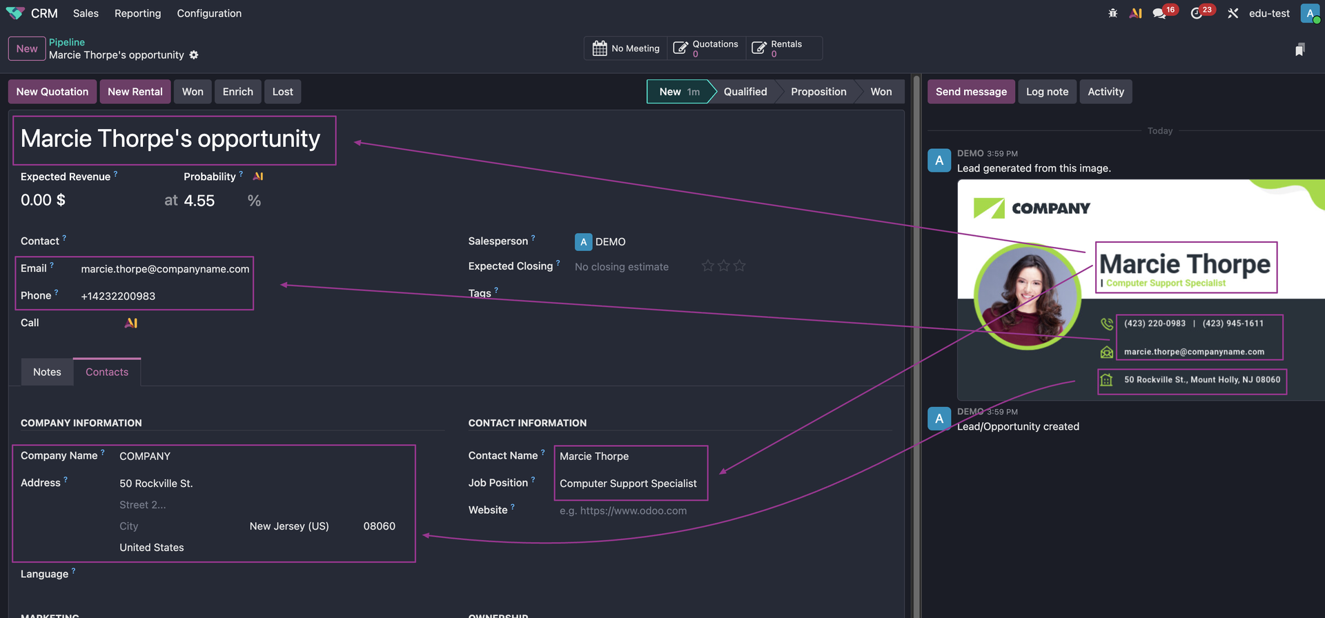 Watch as Odoo's AI goes to work. Within seconds, your opportunities are created with the following fields automatically populated: